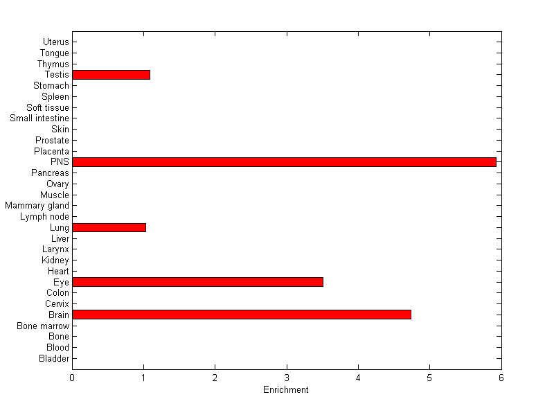 About the profile: The expression level is normalized with tissue-library size. Each value for a gene in a tissue is a ratio of observed ESTs to the expected one in this tissue. The expected number of ESTs is the product of total ESTs of the gene and the fraction of total ESTs in the tissue among all ESTs in 30 tissues. Download: |