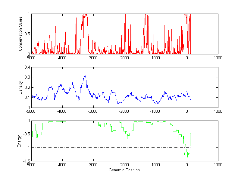 About the profiles: The conservation profile (red curve) is about conservation scores of the promoter sequences. Conservation was determined from an eight-way alignment of human, chimpanzee, dog, mouse, rat, chicken, zebrafish and fugu sequences. The conservation was quantified by a conservation score between 0 and 1, with 1 as highest conservation. The conservation score was obtained from UCSC genome databases. The density profile (blue curve) is about density of all TF binding sites. The energy profile (green curve) is about energy for module detection based on TF interaction. The positions with energy less than -1 indicate the existence of CRMs. Download: Conservation profileDensity profile Energy profile CRM summary |