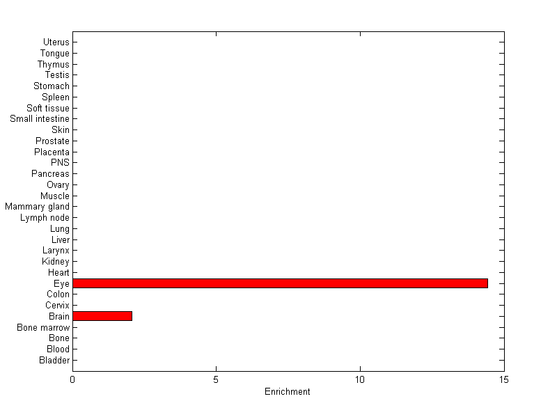 About the profile: The expression level is normalized with tissue-library size. Each value for a gene in a tissue is a ratio of observed ESTs to the expected one in this tissue. The expected number of ESTs is the product of total ESTs of the gene and the fraction of total ESTs in the tissue among all ESTs in 30 tissues. Summary: This gene is preferentially expressed in [eye] Download: |