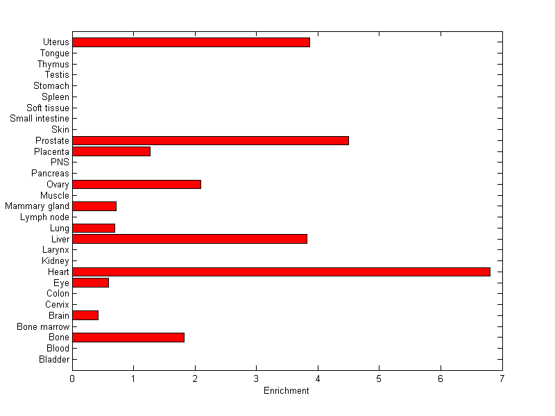 The expression level is normalized with tissue-library size. Each value for a gene in a tissue is a ratio of observed ESTs to the expected one in this tissue. The expected number of ESTs is the product of total ESTs of the gene and the fraction of total ESTs in the tissue among all ESTs in 30 tissues.