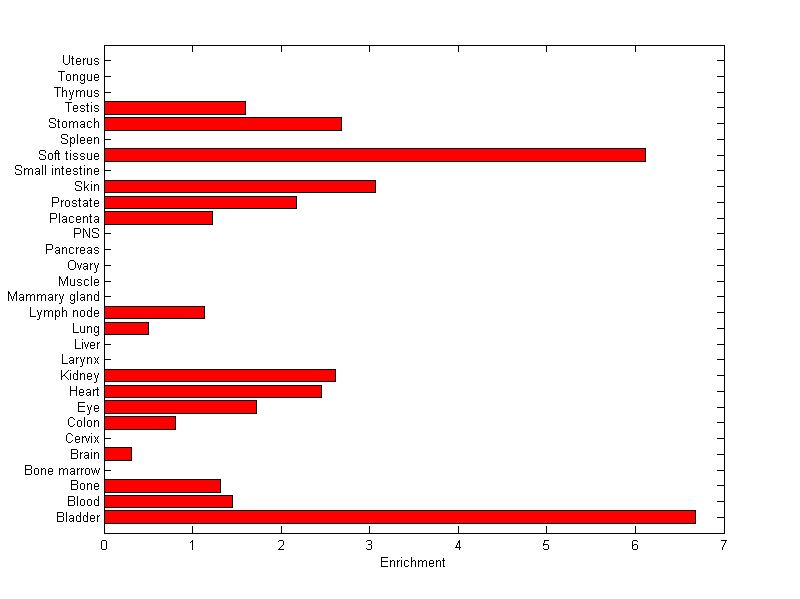 The expression level is normalized with tissue-library size. Each value for a gene in a tissue is a ratio of observed ESTs to the expected one in this tissue. The expected number of ESTs is the product of total ESTs of the gene and the fraction of total ESTs in the tissue among all ESTs in 30 tissues.
