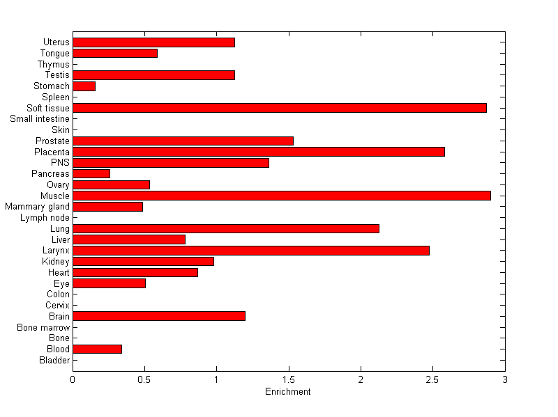 The expression level is normalized with tissue-library size. Each value for a gene in a tissue is a ratio of observed ESTs to the expected one in this tissue. The expected number of ESTs is the product of total ESTs of the gene and the fraction of total ESTs in the tissue among all ESTs in 30 tissues.