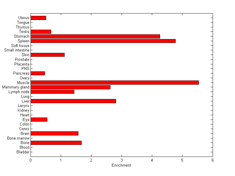 The expression level is normalized with tissue-library size. Each value for a gene in a tissue is a ratio of observed ESTs to the expected one in this tissue. The expected number of ESTs is the product of total ESTs of the gene and the fraction of total ESTs in the tissue among all ESTs in 30 tissues.