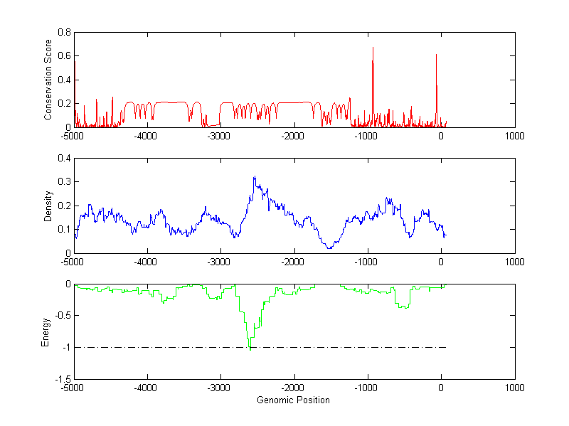 The energy profile (green curve) is about energy for module detection based on TF interaction. The positions with energy less than -1 indicate the existence of CRMs.