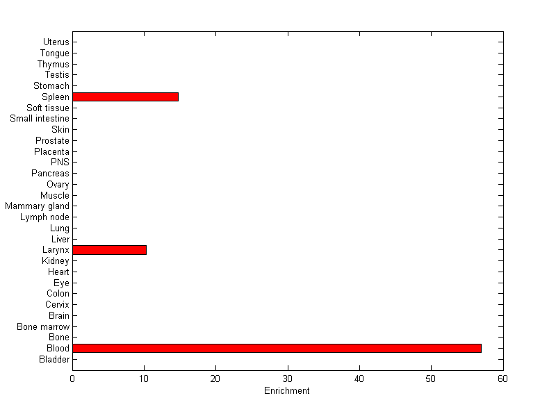 The expression level is normalized with tissue-library size. Each value for a gene in a tissue is a ratio of observed ESTs to the expected one in this tissue. The expected number of ESTs is the product of total ESTs of the gene and the fraction of total ESTs in the tissue among all ESTs in 30 tissues.