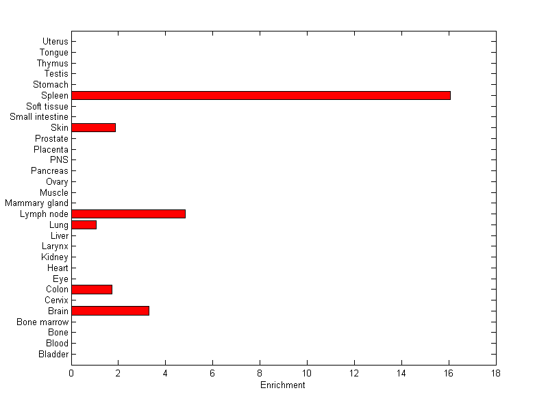 The expression level is normalized with tissue-library size. Each value for a gene in a tissue is a ratio of observed ESTs to the expected one in this tissue. The expected number of ESTs is the product of total ESTs of the gene and the fraction of total ESTs in the tissue among all ESTs in 30 tissues.