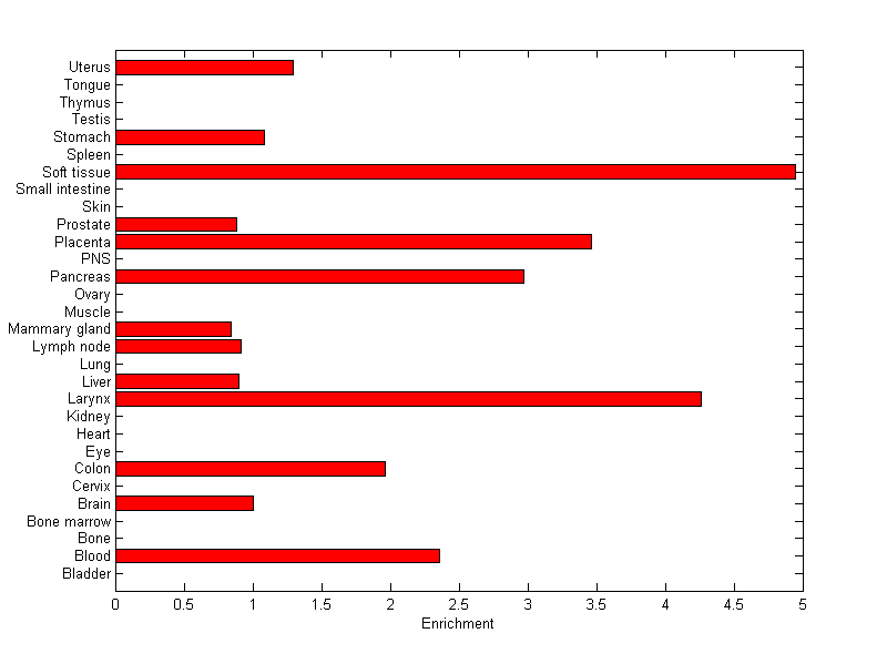 The expression level is normalized with tissue-library size. Each value for a gene in a tissue is a ratio of observed ESTs to the expected one in this tissue. The expected number of ESTs is the product of total ESTs of the gene and the fraction of total ESTs in the tissue among all ESTs in 30 tissues.