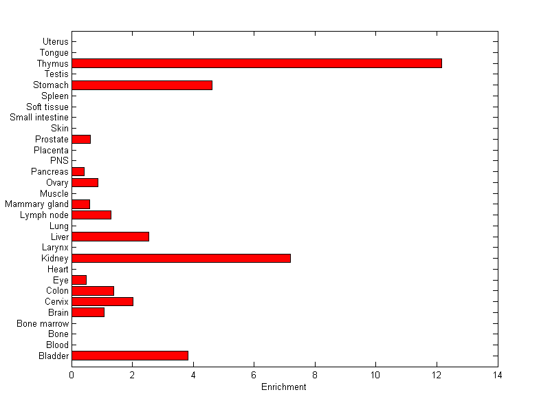 The expression level is normalized with tissue-library size. Each value for a gene in a tissue is a ratio of observed ESTs to the expected one in this tissue. The expected number of ESTs is the product of total ESTs of the gene and the fraction of total ESTs in the tissue among all ESTs in 30 tissues.