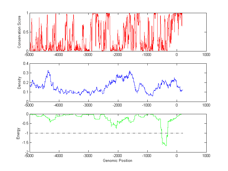 The energy profile (green curve) is about energy for module detection based on TF interaction. The positions with energy less than -1 indicate the existence of CRMs.