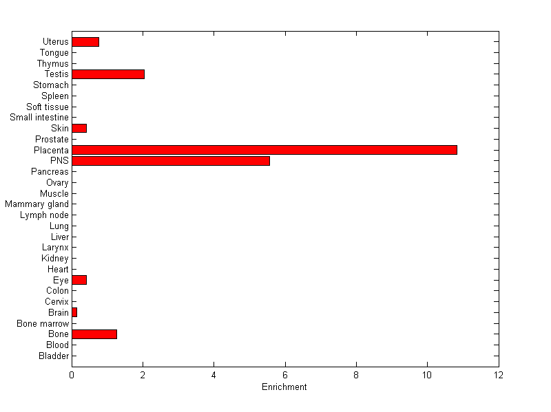 The expression level is normalized with tissue-library size. Each value for a gene in a tissue is a ratio of observed ESTs to the expected one in this tissue. The expected number of ESTs is the product of total ESTs of the gene and the fraction of total ESTs in the tissue among all ESTs in 30 tissues.