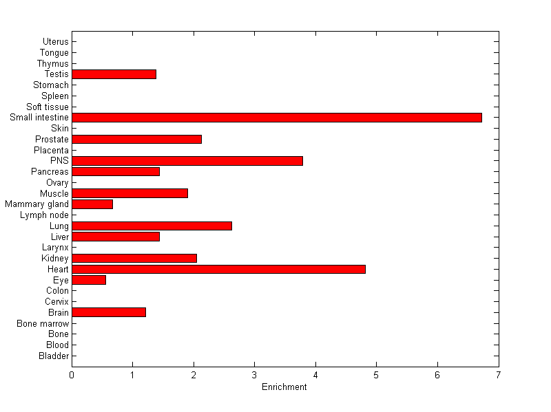 The expression level is normalized with tissue-library size. Each value for a gene in a tissue is a ratio of observed ESTs to the expected one in this tissue. The expected number of ESTs is the product of total ESTs of the gene and the fraction of total ESTs in the tissue among all ESTs in 30 tissues.