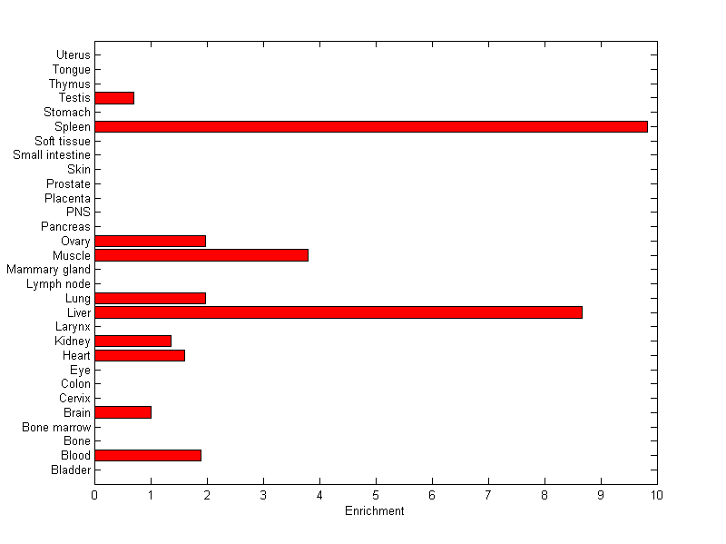 The expression level is normalized with tissue-library size. Each value for a gene in a tissue is a ratio of observed ESTs to the expected one in this tissue. The expected number of ESTs is the product of total ESTs of the gene and the fraction of total ESTs in the tissue among all ESTs in 30 tissues.