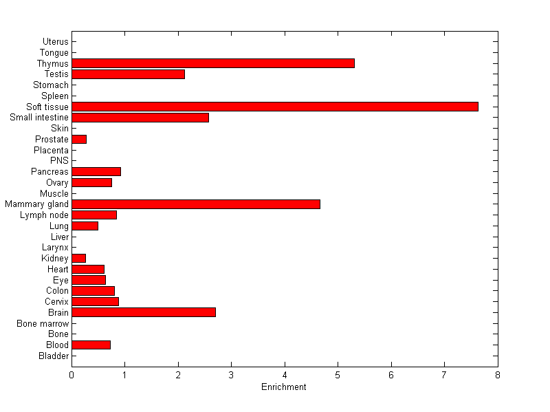 The expression level is normalized with tissue-library size. Each value for a gene in a tissue is a ratio of observed ESTs to the expected one in this tissue. The expected number of ESTs is the product of total ESTs of the gene and the fraction of total ESTs in the tissue among all ESTs in 30 tissues.
