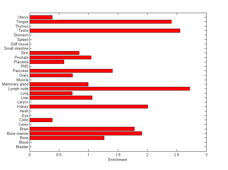 The expression level is normalized with tissue-library size. Each value for a gene in a tissue is a ratio of observed ESTs to the expected one in this tissue. The expected number of ESTs is the product of total ESTs of the gene and the fraction of total ESTs in the tissue among all ESTs in 30 tissues.