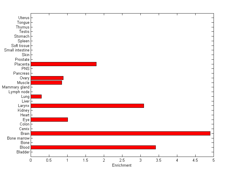 The expression level is normalized with tissue-library size. Each value for a gene in a tissue is a ratio of observed ESTs to the expected one in this tissue. The expected number of ESTs is the product of total ESTs of the gene and the fraction of total ESTs in the tissue among all ESTs in 30 tissues.