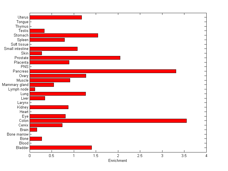 The expression level is normalized with tissue-library size. Each value for a gene in a tissue is a ratio of observed ESTs to the expected one in this tissue. The expected number of ESTs is the product of total ESTs of the gene and the fraction of total ESTs in the tissue among all ESTs in 30 tissues.