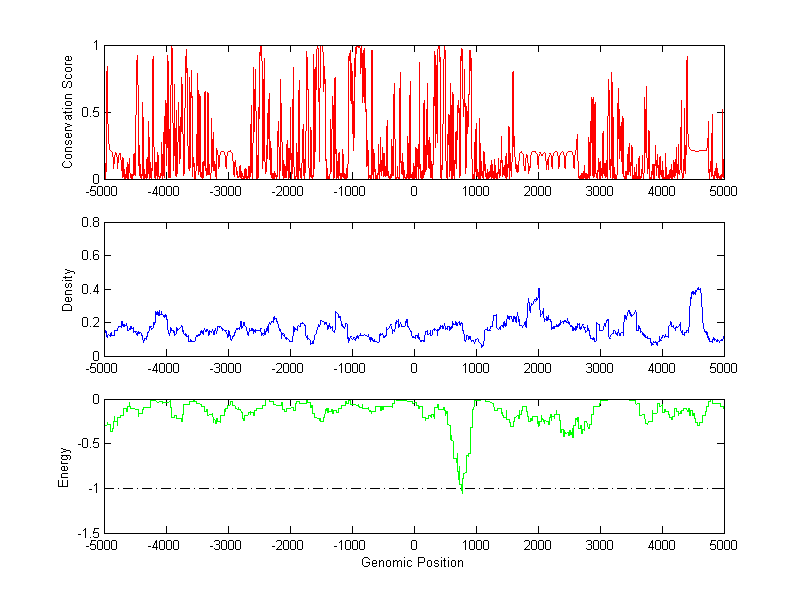 The energy profile (green curve) is about energy for module detection based on TF interaction. The positions with energy less than -1 indicate the existence of CRMs.