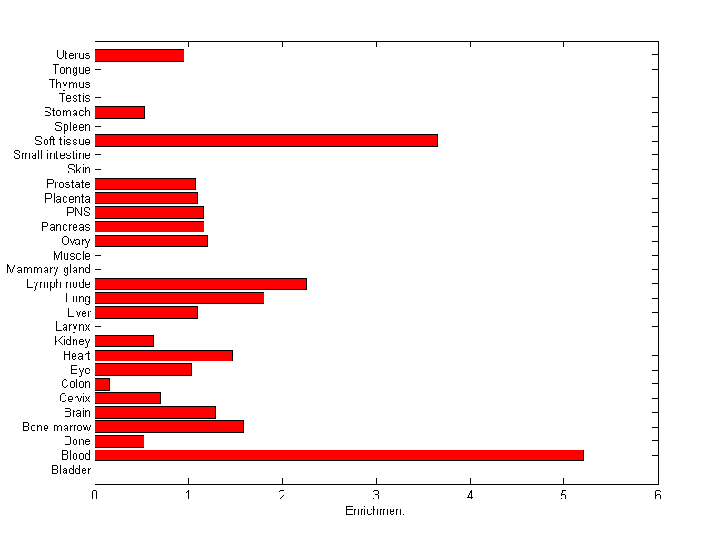 The expression level is normalized with tissue-library size. Each value for a gene in a tissue is a ratio of observed ESTs to the expected one in this tissue. The expected number of ESTs is the product of total ESTs of the gene and the fraction of total ESTs in the tissue among all ESTs in 30 tissues.