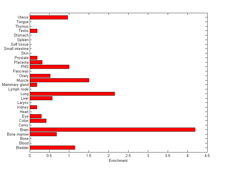 The expression level is normalized with tissue-library size. Each value for a gene in a tissue is a ratio of observed ESTs to the expected one in this tissue. The expected number of ESTs is the product of total ESTs of the gene and the fraction of total ESTs in the tissue among all ESTs in 30 tissues.