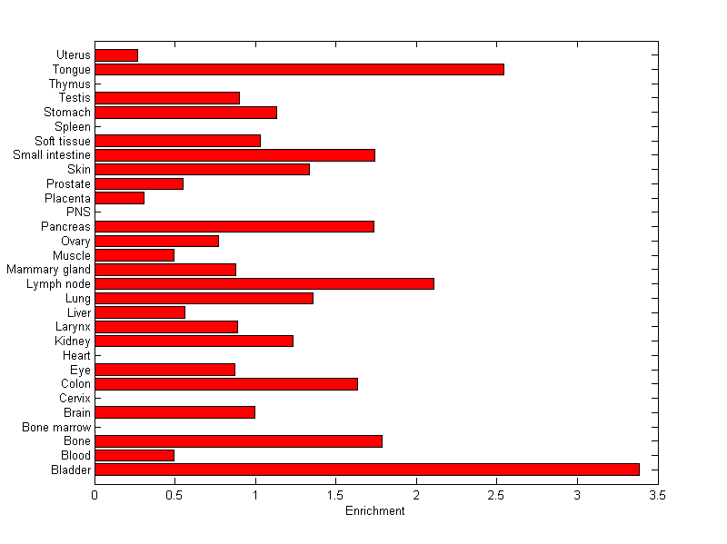 The expression level is normalized with tissue-library size. Each value for a gene in a tissue is a ratio of observed ESTs to the expected one in this tissue. The expected number of ESTs is the product of total ESTs of the gene and the fraction of total ESTs in the tissue among all ESTs in 30 tissues.