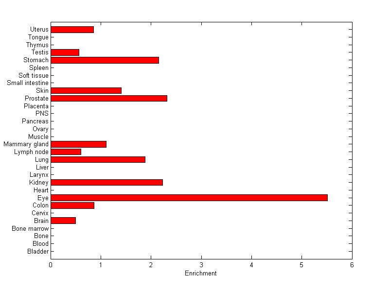 The expression level is normalized with tissue-library size. Each value for a gene in a tissue is a ratio of observed ESTs to the expected one in this tissue. The expected number of ESTs is the product of total ESTs of the gene and the fraction of total ESTs in the tissue among all ESTs in 30 tissues.