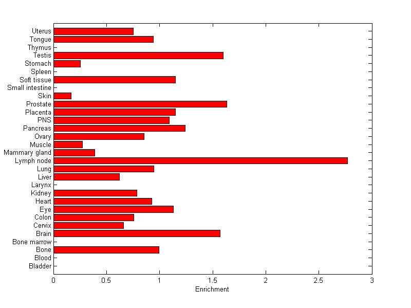 The expression level is normalized with tissue-library size. Each value for a gene in a tissue is a ratio of observed ESTs to the expected one in this tissue. The expected number of ESTs is the product of total ESTs of the gene and the fraction of total ESTs in the tissue among all ESTs in 30 tissues.