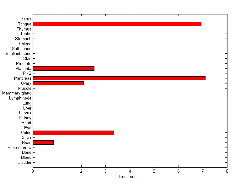 About the profile: The expression level is normalized with tissue-library size. Each value for a gene in a tissue is a ratio of observed ESTs to the expected one in this tissue. The expected number of ESTs is the product of total ESTs of the gene and the fraction of total ESTs in the tissue among all ESTs in 30 tissues. Summary: This gene is preferentially expressed in [pancreas] Download: |