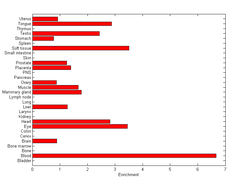 The expression level is normalized with tissue-library size. Each value for a gene in a tissue is a ratio of observed ESTs to the expected one in this tissue. The expected number of ESTs is the product of total ESTs of the gene and the fraction of total ESTs in the tissue among all ESTs in 30 tissues.