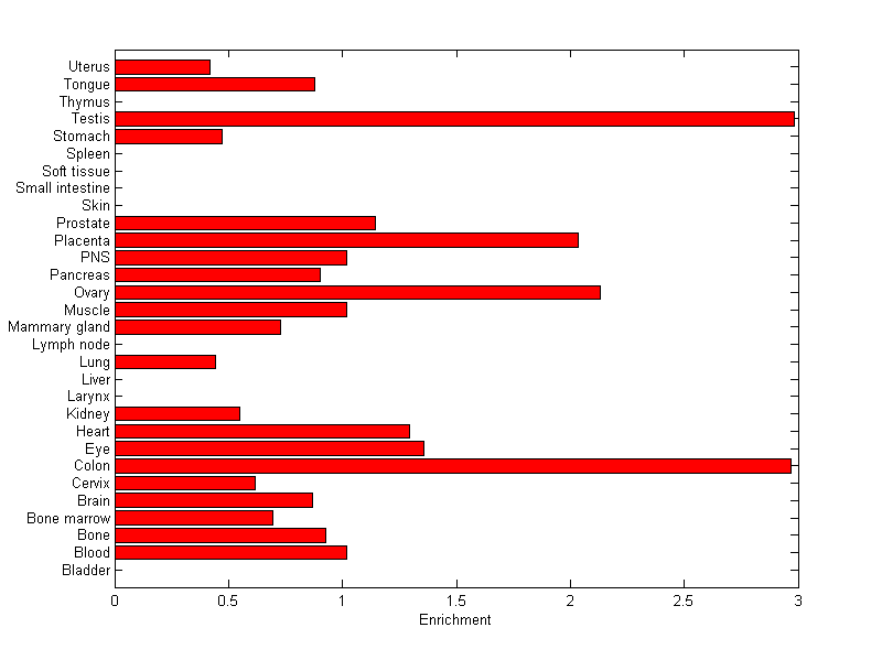 The expression level is normalized with tissue-library size. Each value for a gene in a tissue is a ratio of observed ESTs to the expected one in this tissue. The expected number of ESTs is the product of total ESTs of the gene and the fraction of total ESTs in the tissue among all ESTs in 30 tissues.