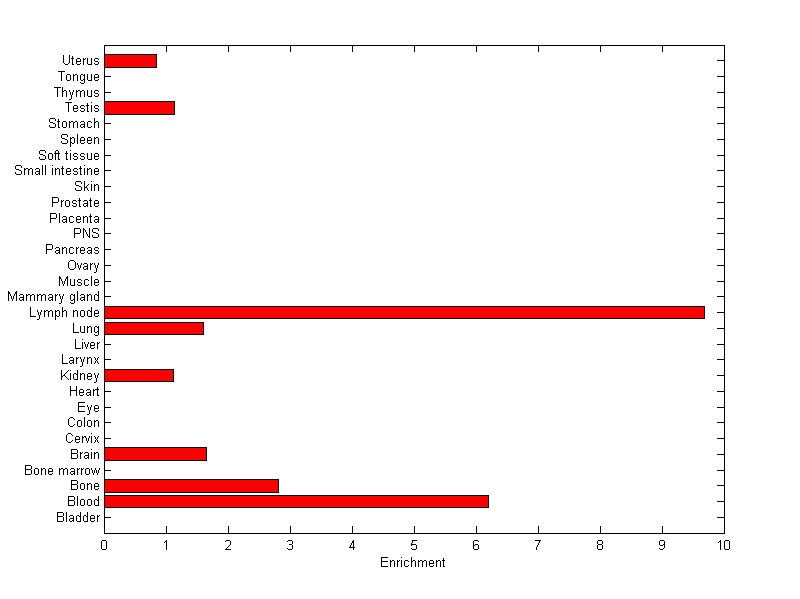 The expression level is normalized with tissue-library size. Each value for a gene in a tissue is a ratio of observed ESTs to the expected one in this tissue. The expected number of ESTs is the product of total ESTs of the gene and the fraction of total ESTs in the tissue among all ESTs in 30 tissues.