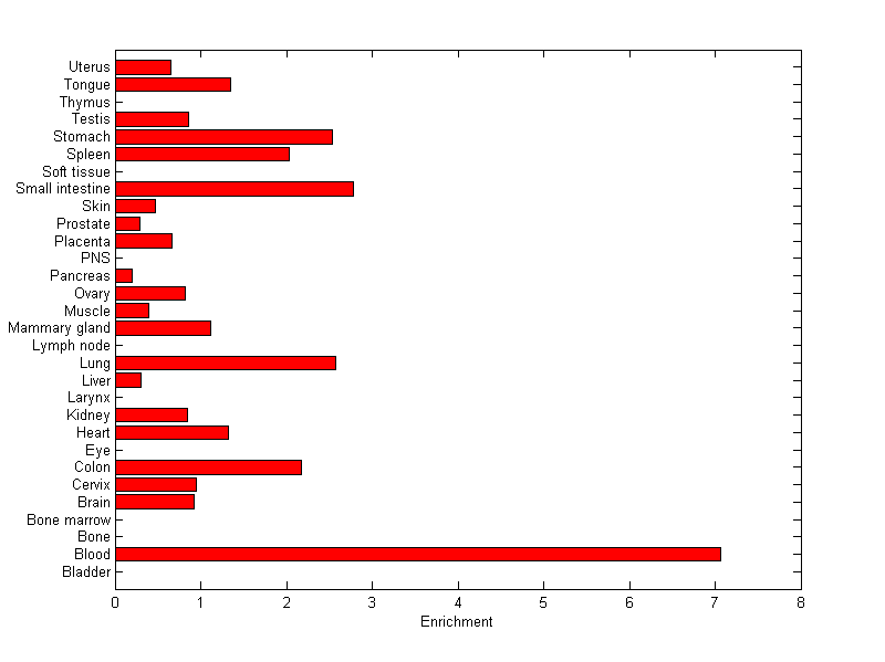 The expression level is normalized with tissue-library size. Each value for a gene in a tissue is a ratio of observed ESTs to the expected one in this tissue. The expected number of ESTs is the product of total ESTs of the gene and the fraction of total ESTs in the tissue among all ESTs in 30 tissues.