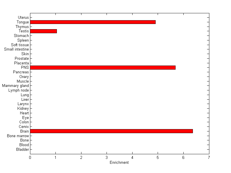 The expression level is normalized with tissue-library size. Each value for a gene in a tissue is a ratio of observed ESTs to the expected one in this tissue. The expected number of ESTs is the product of total ESTs of the gene and the fraction of total ESTs in the tissue among all ESTs in 30 tissues.