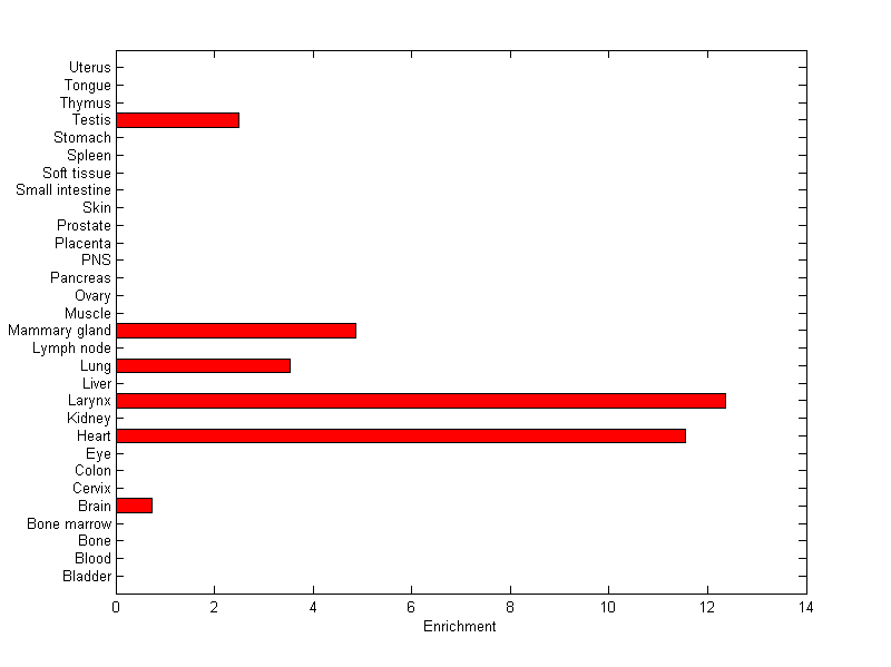 The expression level is normalized with tissue-library size. Each value for a gene in a tissue is a ratio of observed ESTs to the expected one in this tissue. The expected number of ESTs is the product of total ESTs of the gene and the fraction of total ESTs in the tissue among all ESTs in 30 tissues.