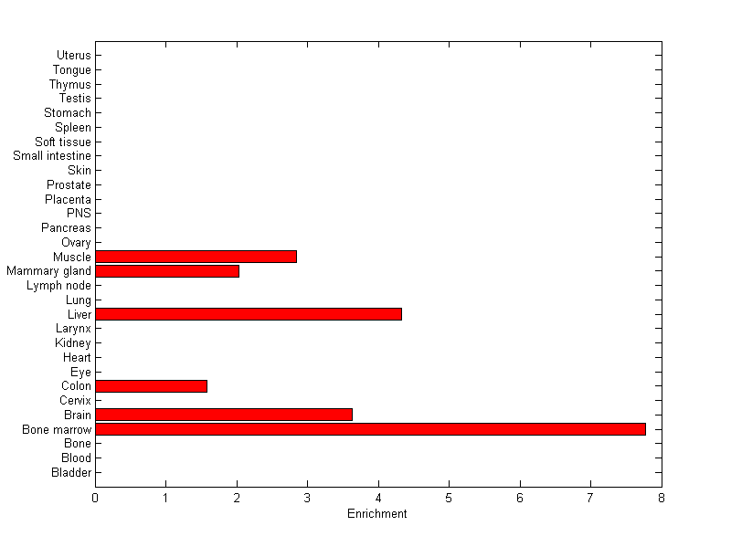 The expression level is normalized with tissue-library size. Each value for a gene in a tissue is a ratio of observed ESTs to the expected one in this tissue. The expected number of ESTs is the product of total ESTs of the gene and the fraction of total ESTs in the tissue among all ESTs in 30 tissues.