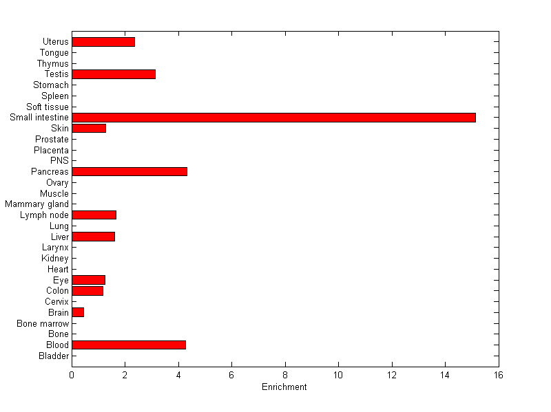 The expression level is normalized with tissue-library size. Each value for a gene in a tissue is a ratio of observed ESTs to the expected one in this tissue. The expected number of ESTs is the product of total ESTs of the gene and the fraction of total ESTs in the tissue among all ESTs in 30 tissues.