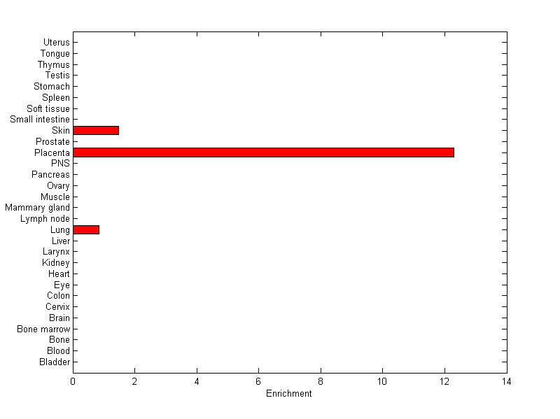 The expression level is normalized with tissue-library size. Each value for a gene in a tissue is a ratio of observed ESTs to the expected one in this tissue. The expected number of ESTs is the product of total ESTs of the gene and the fraction of total ESTs in the tissue among all ESTs in 30 tissues.