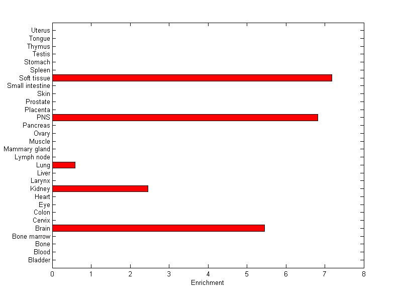 About the profile: The expression level is normalized with tissue-library size. Each value for a gene in a tissue is a ratio of observed ESTs to the expected one in this tissue. The expected number of ESTs is the product of total ESTs of the gene and the fraction of total ESTs in the tissue among all ESTs in 30 tissues. Summary: This gene is preferentially expressed in [brain] Download: |