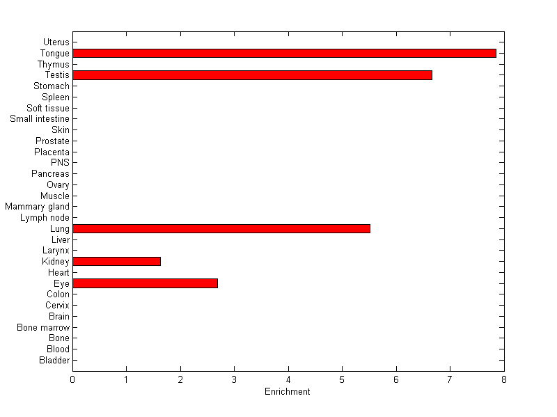 The expression level is normalized with tissue-library size. Each value for a gene in a tissue is a ratio of observed ESTs to the expected one in this tissue. The expected number of ESTs is the product of total ESTs of the gene and the fraction of total ESTs in the tissue among all ESTs in 30 tissues.