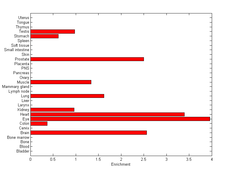 The expression level is normalized with tissue-library size. Each value for a gene in a tissue is a ratio of observed ESTs to the expected one in this tissue. The expected number of ESTs is the product of total ESTs of the gene and the fraction of total ESTs in the tissue among all ESTs in 30 tissues.