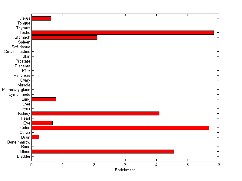 About the profile: The expression level is normalized with tissue-library size. Each value for a gene in a tissue is a ratio of observed ESTs to the expected one in this tissue. The expected number of ESTs is the product of total ESTs of the gene and the fraction of total ESTs in the tissue among all ESTs in 30 tissues. Summary: This gene is preferentially expressed in [colon, testis] Download: |