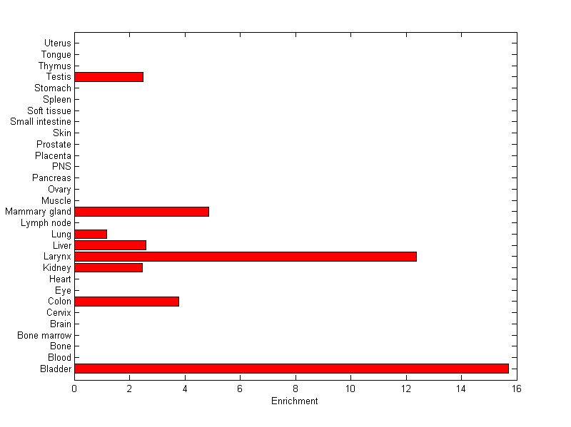 The expression level is normalized with tissue-library size. Each value for a gene in a tissue is a ratio of observed ESTs to the expected one in this tissue. The expected number of ESTs is the product of total ESTs of the gene and the fraction of total ESTs in the tissue among all ESTs in 30 tissues.