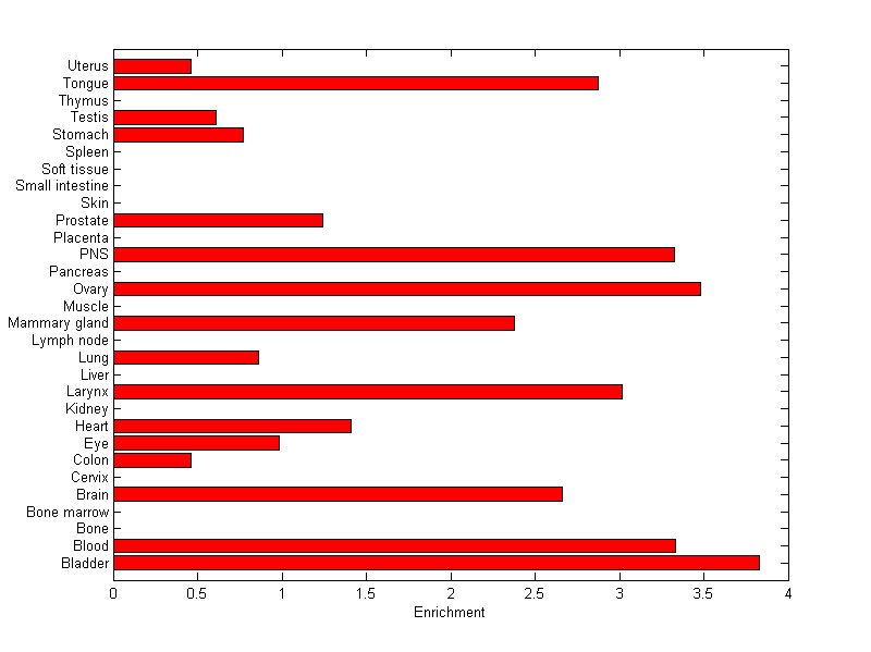 The expression level is normalized with tissue-library size. Each value for a gene in a tissue is a ratio of observed ESTs to the expected one in this tissue. The expected number of ESTs is the product of total ESTs of the gene and the fraction of total ESTs in the tissue among all ESTs in 30 tissues.