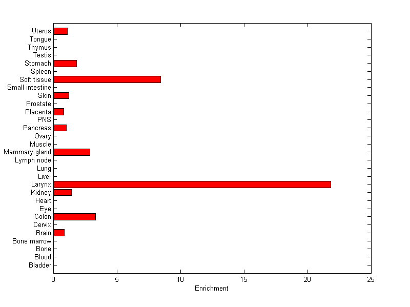 The expression level is normalized with tissue-library size. Each value for a gene in a tissue is a ratio of observed ESTs to the expected one in this tissue. The expected number of ESTs is the product of total ESTs of the gene and the fraction of total ESTs in the tissue among all ESTs in 30 tissues.
