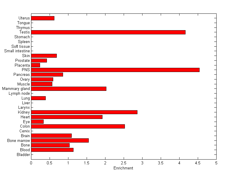 The expression level is normalized with tissue-library size. Each value for a gene in a tissue is a ratio of observed ESTs to the expected one in this tissue. The expected number of ESTs is the product of total ESTs of the gene and the fraction of total ESTs in the tissue among all ESTs in 30 tissues.