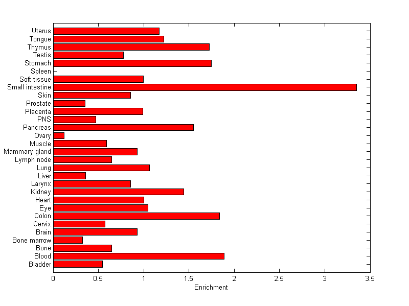 The expression level is normalized with tissue-library size. Each value for a gene in a tissue is a ratio of observed ESTs to the expected one in this tissue. The expected number of ESTs is the product of total ESTs of the gene and the fraction of total ESTs in the tissue among all ESTs in 30 tissues.