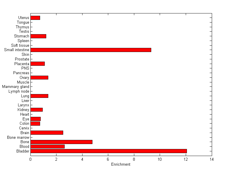 The expression level is normalized with tissue-library size. Each value for a gene in a tissue is a ratio of observed ESTs to the expected one in this tissue. The expected number of ESTs is the product of total ESTs of the gene and the fraction of total ESTs in the tissue among all ESTs in 30 tissues.