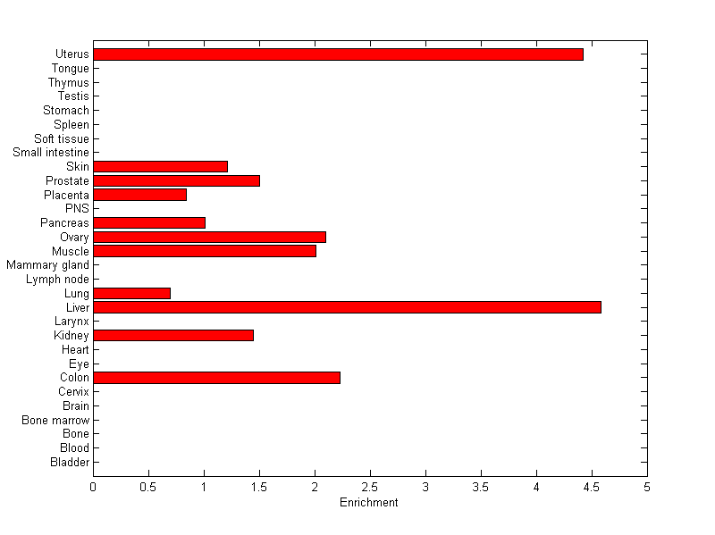 The expression level is normalized with tissue-library size. Each value for a gene in a tissue is a ratio of observed ESTs to the expected one in this tissue. The expected number of ESTs is the product of total ESTs of the gene and the fraction of total ESTs in the tissue among all ESTs in 30 tissues.