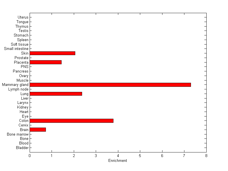 The expression level is normalized with tissue-library size. Each value for a gene in a tissue is a ratio of observed ESTs to the expected one in this tissue. The expected number of ESTs is the product of total ESTs of the gene and the fraction of total ESTs in the tissue among all ESTs in 30 tissues.