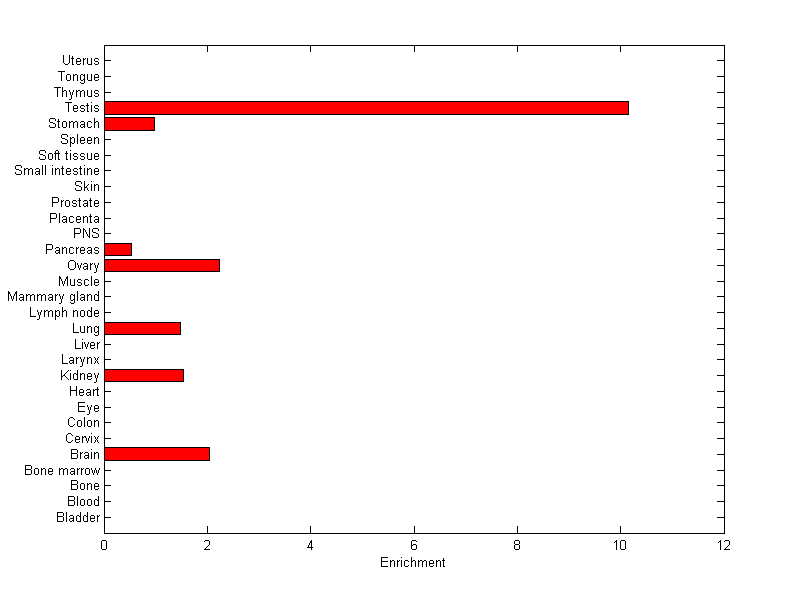 The expression level is normalized with tissue-library size. Each value for a gene in a tissue is a ratio of observed ESTs to the expected one in this tissue. The expected number of ESTs is the product of total ESTs of the gene and the fraction of total ESTs in the tissue among all ESTs in 30 tissues.