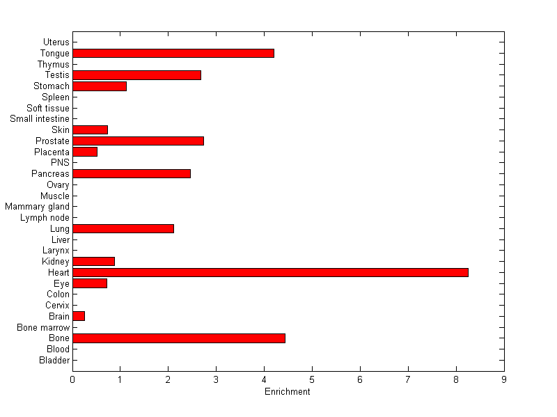The expression level is normalized with tissue-library size. Each value for a gene in a tissue is a ratio of observed ESTs to the expected one in this tissue. The expected number of ESTs is the product of total ESTs of the gene and the fraction of total ESTs in the tissue among all ESTs in 30 tissues.